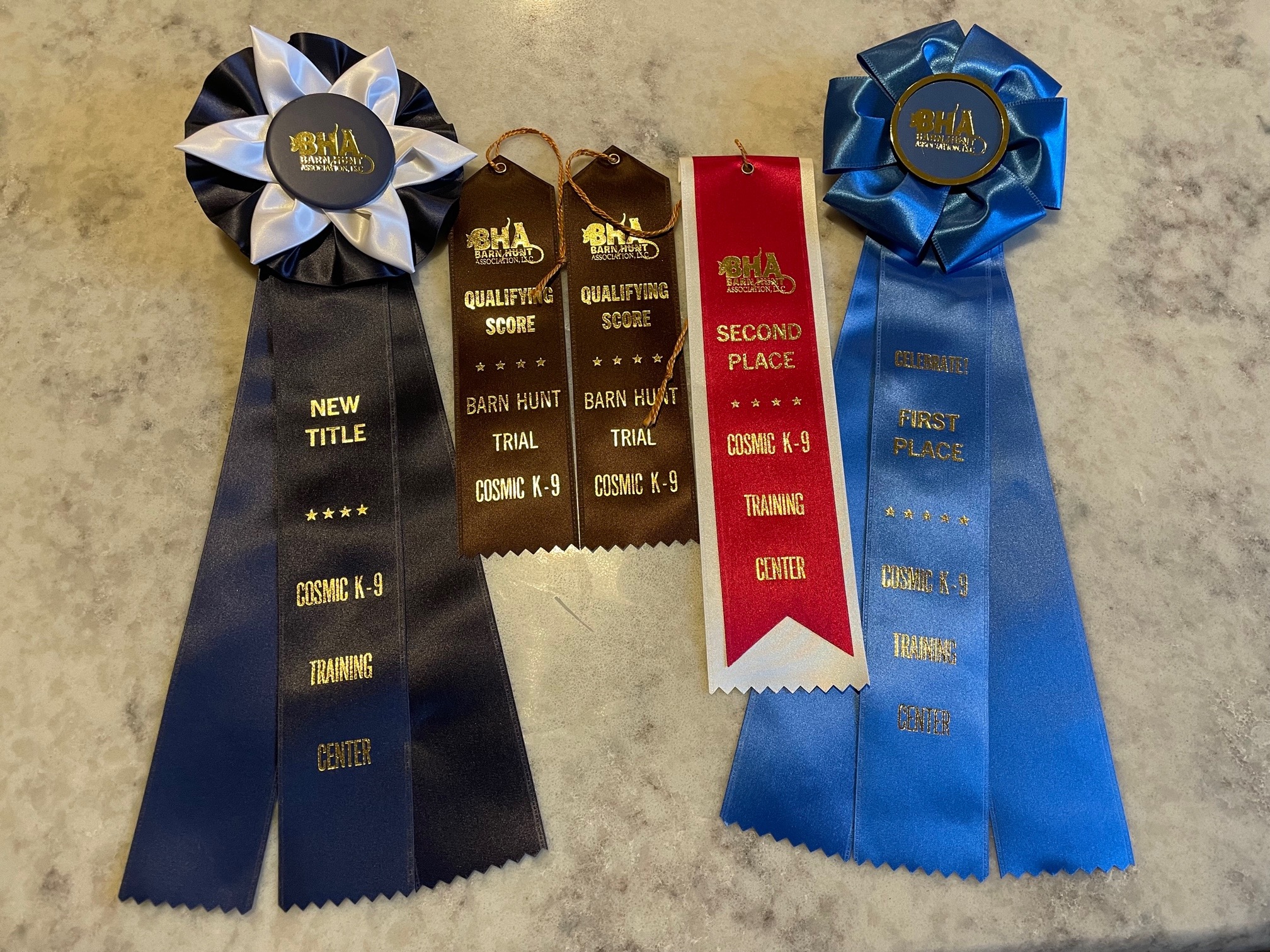 Iza earned her first Novice Barn Hunt leg and some impressive ribbons under judge Brenda Lund