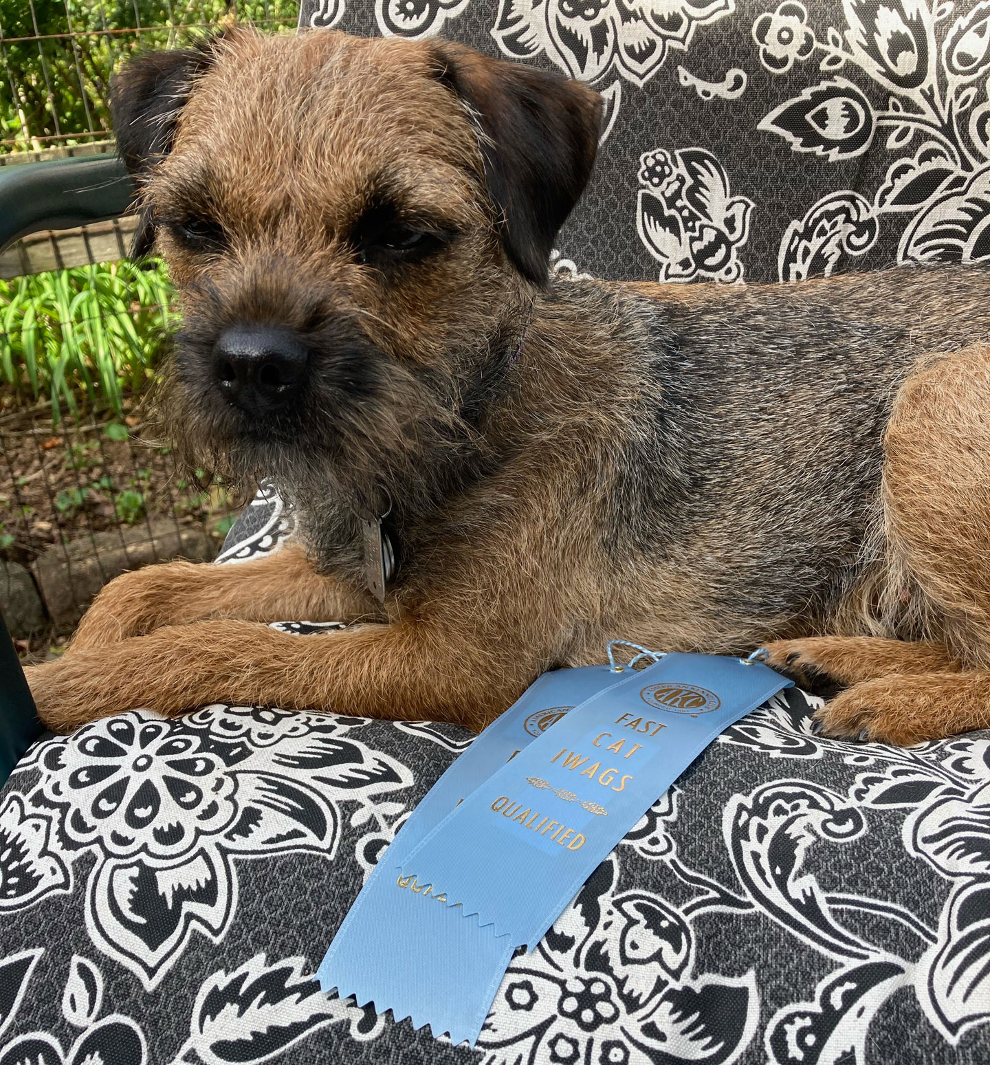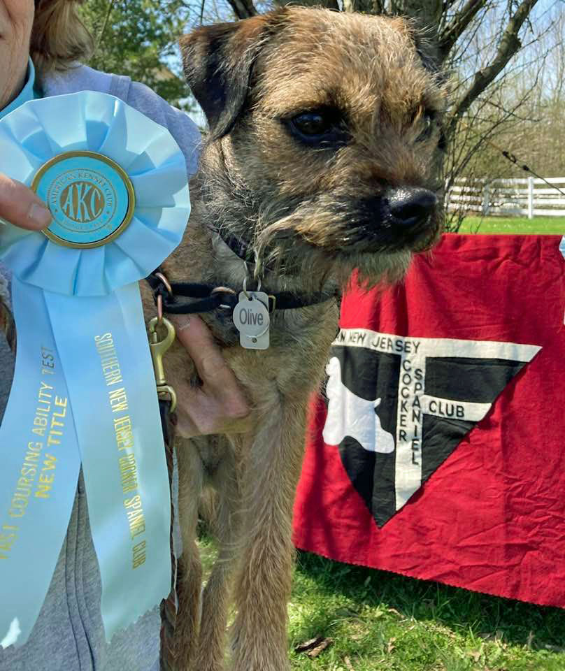 A wet serious looking Olive who Q’d in 5 out of 6 events to earn her Advanced title. Good girl Olive! She had more fun than this photo suggests as she loves the sport, just not photo shoots!