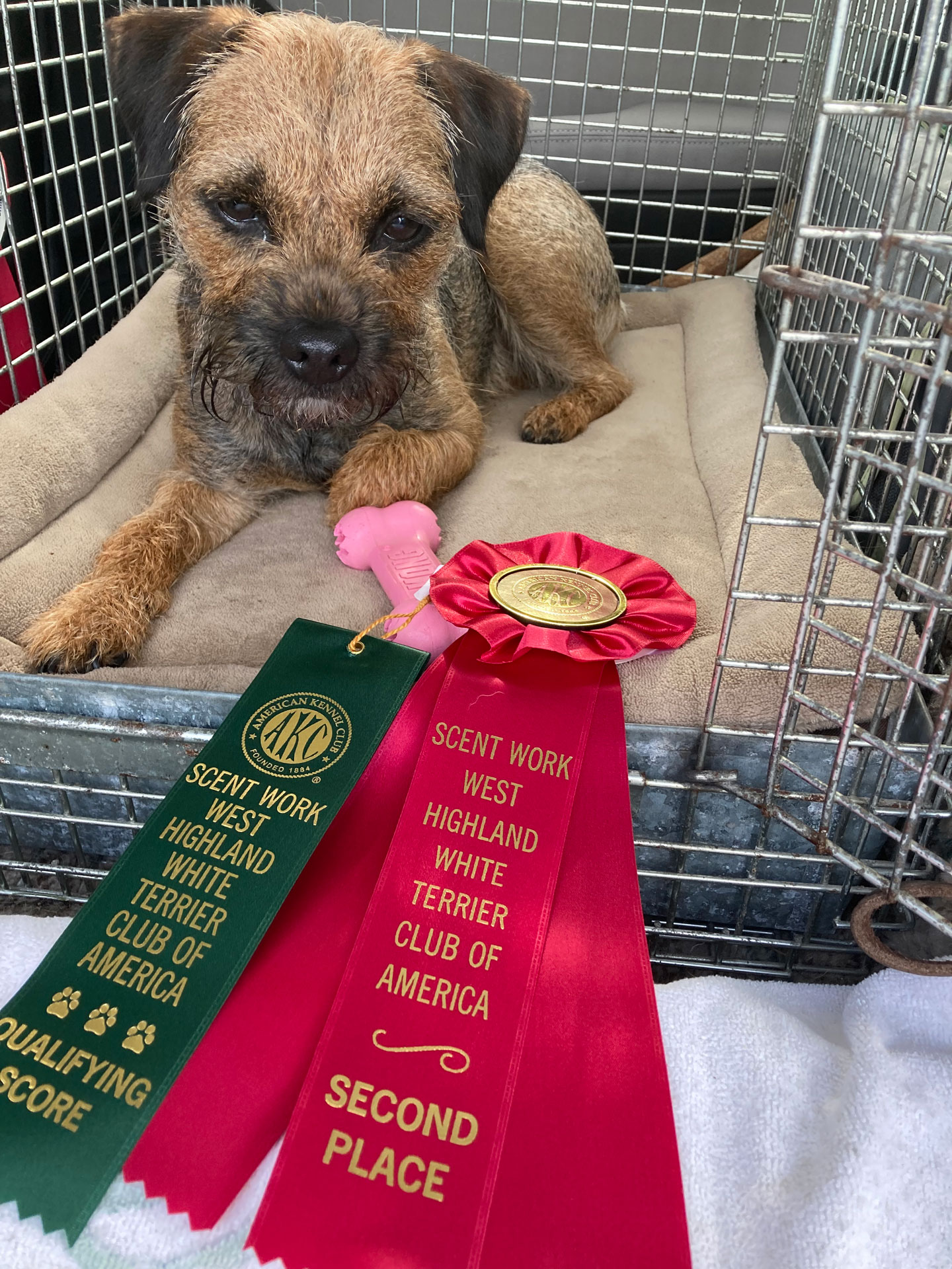 Olive also made her debut in Scentwork a successful one. She qualified in Novice Exteriors with second place and in Novice Containers with a fourth place.