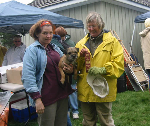 On Sunday morning, shortly after 8am (before having any time to get blasé), Ms. Molly took a Group 3 under P. Machen! Woo hoo! In the afternoon, we did the Temperament Test and Molly passed with flying colours. The cuteness highlight was that she politely sat to be petted by the "friendly stranger" and was about to roll over for a belly-rub as we left for the next station; the firey highlight was that she pointed at, growled and barked, and tried to chase the "threatening stranger." She also added at least a half dozen people to her fan club. Is it obvious how I adore this little dog? (There was no competition in Breed, and a strong Terrier Group, so Molly did not place on Saturday, but a Lakie took BIS in one show and an Airedale BPIS on Sunday - go Terriers!)