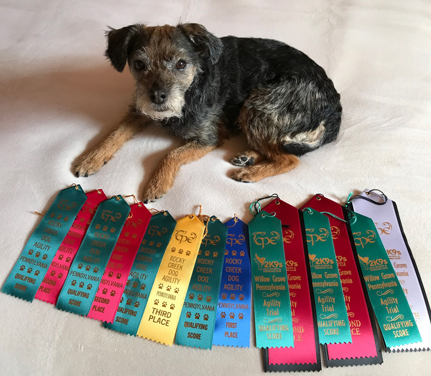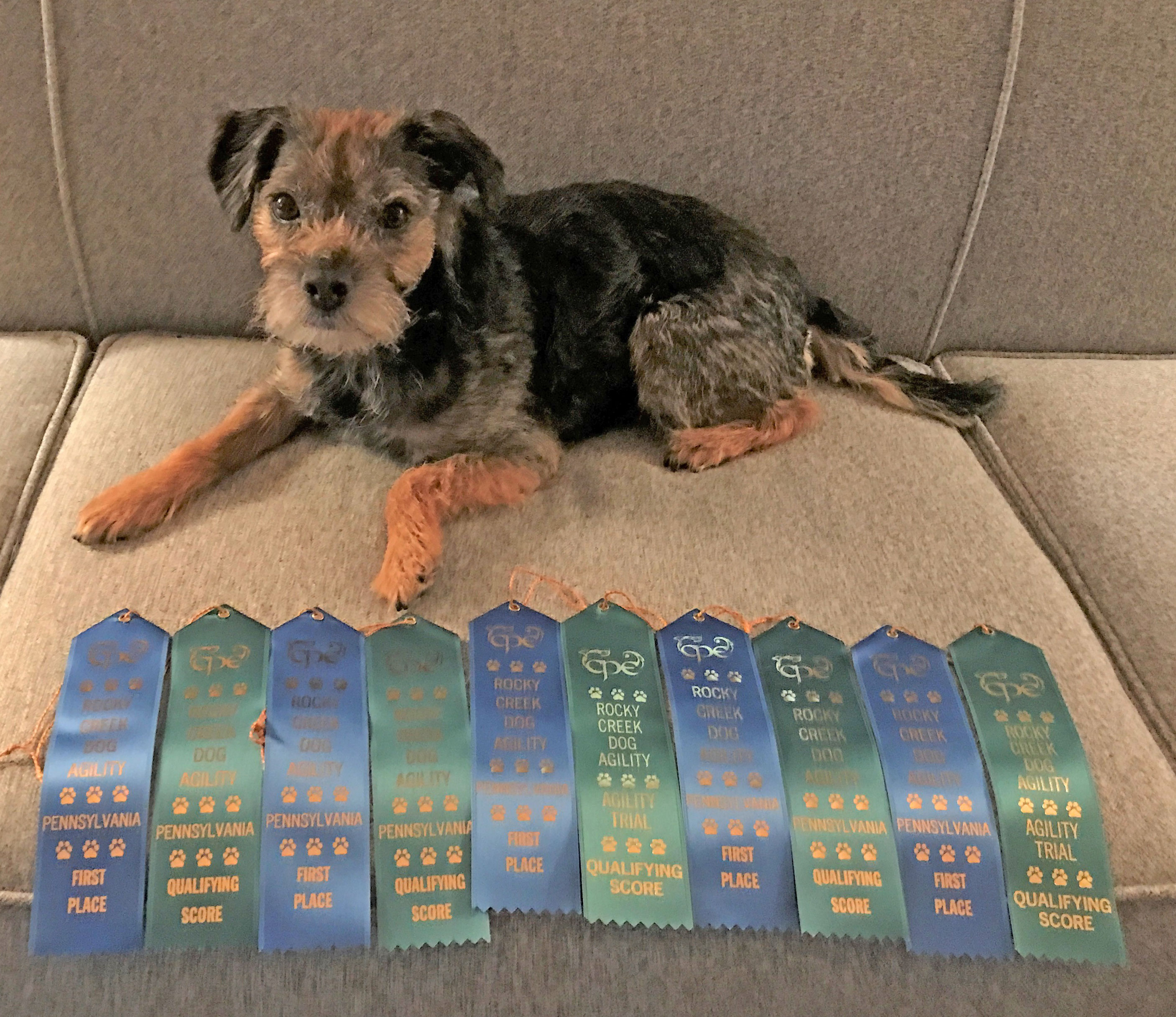 Rosie has been in Novice C since she earned her Novice title. We're working towards her Novice Championship (10 Q's, 185 or higher score).