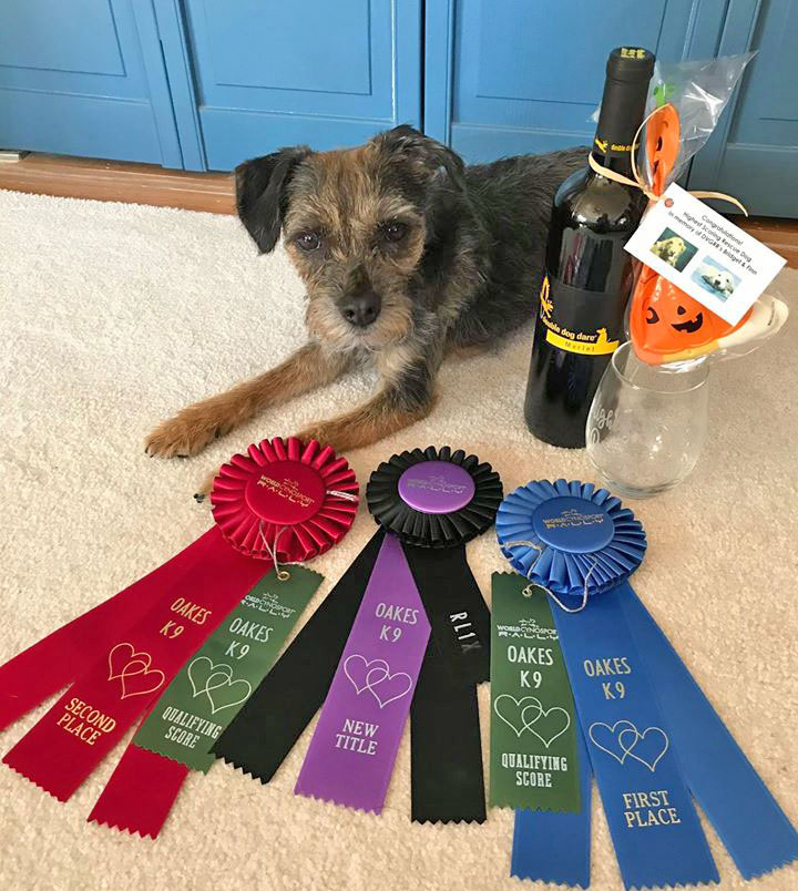 Rosie also won Highest Scoring Rescue Dog, In Memory of DVGRR’s Bridget and Finn. A lovely prize which included a fancy dog cookie, a stemless wine glass (embossed with HSRD) and a bottle of wine.