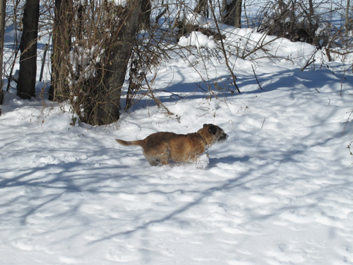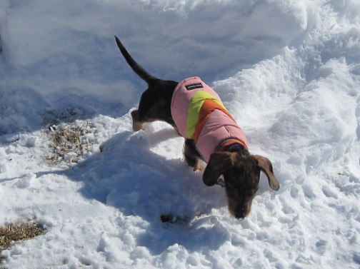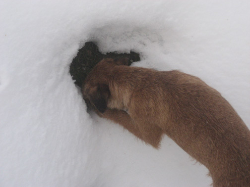 "S'now way to go hunting" - not really sure if Tank is looking for mice in the subnivean layer or trying to dig to Australia where she has heard the weather is warmer