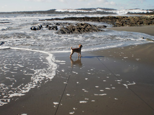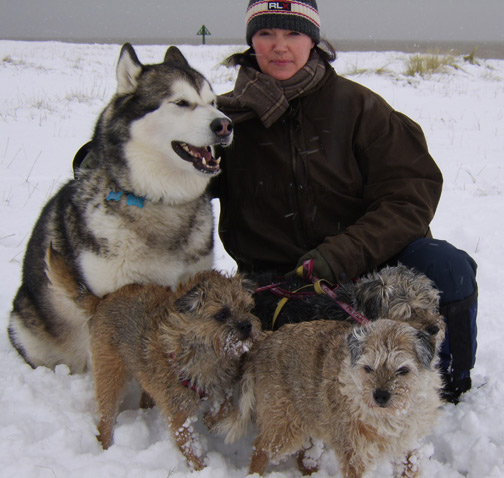 Canadian Artic? No! Jacqueline, Geordie, Iseabail and Tristan on an English Beach - good job they have Kimba in case they need a sled dog.