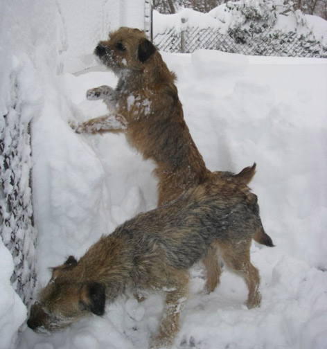 Lizzie unimpressed by puppies or snow, knows the best way to handle winter