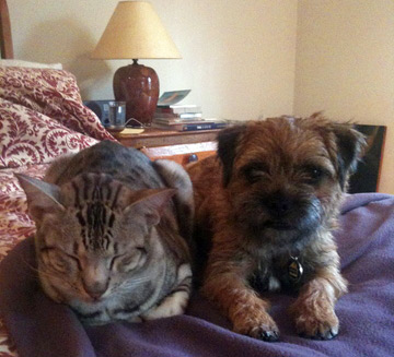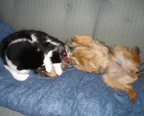 Zeke may be a bit miffed because Rusty the rescue has taken over the apartment complete with new couch, but at least he still has Boomer to cuddle up to!