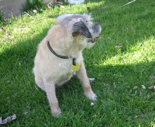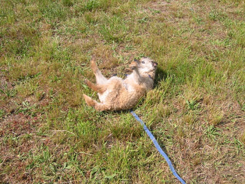 "Feeling Good" - Danny enjoys a good roll in the grass after a haircut and bath.