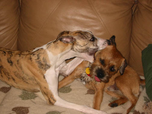 "Bottoms up" - Lurcher looks on while a Border gets "down and dirty"