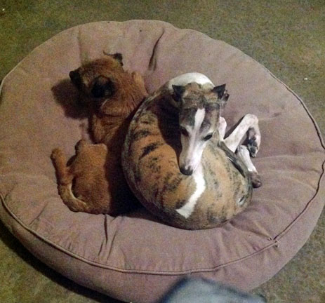 Mel with Molly, Hermit and Fia the whippet (mourning the loss of Puss, Mimi and her six unborn pups)
