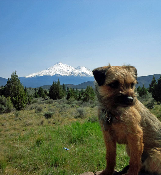 Loki seems unimpressed by the backdrop of Mount Shasta