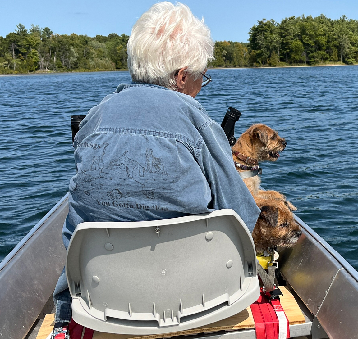 We finally got the boat on the water with the dogs in September, and…as was bound to happen sooner or later…. Pickles went in the water.