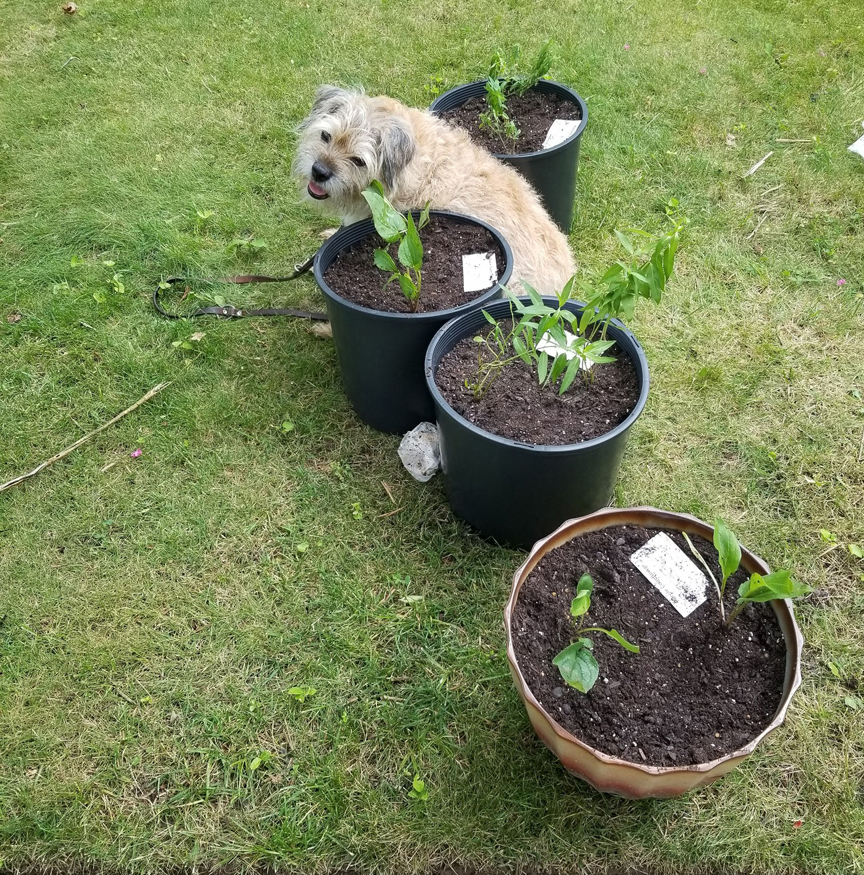 Abbey and Olive look as serious about the flower garden as Fells with his vegetables