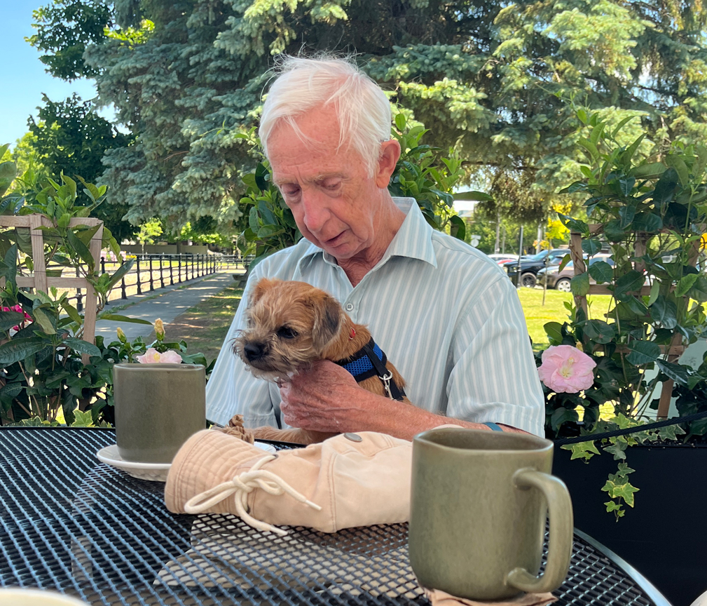 Abbey started her day with a favorite..scrambled eggs. Then accompanied Barb on her first walk out of the house and yard since Barb's knee replacement surgery 10 days ago.