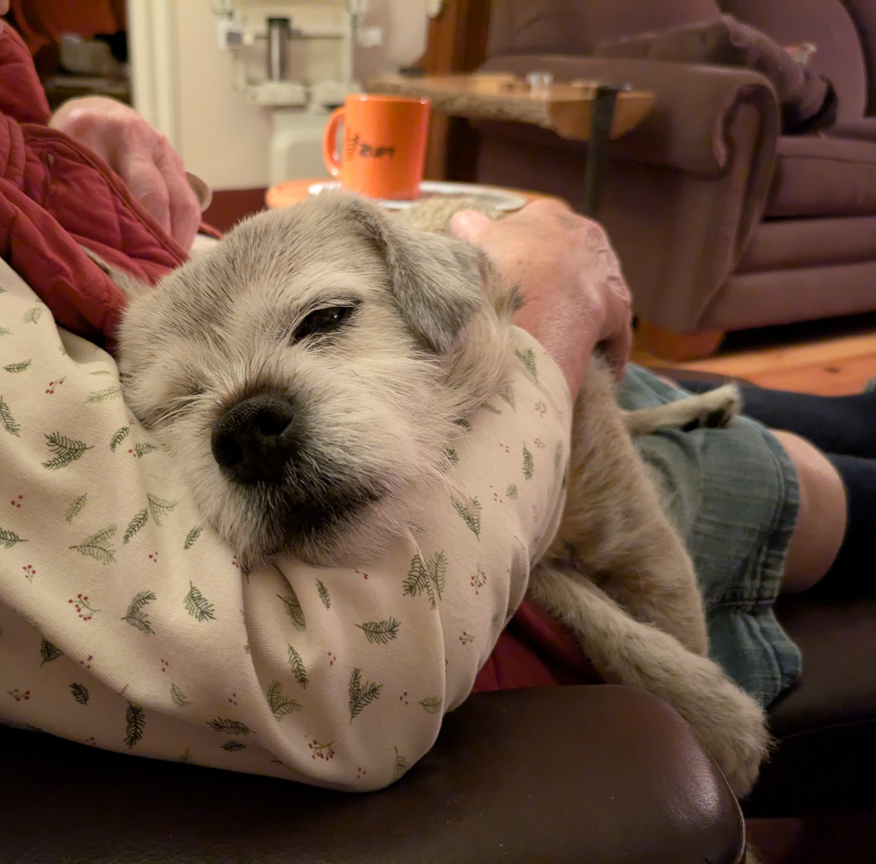 Scrapper cuddling with Shawna, he is a truly special boy and will always be welcome chez Dyer