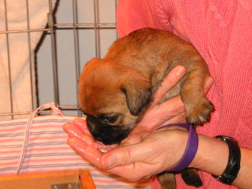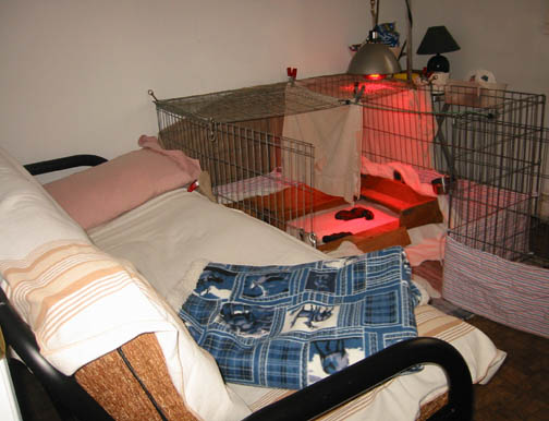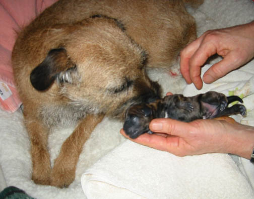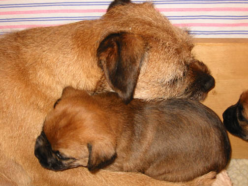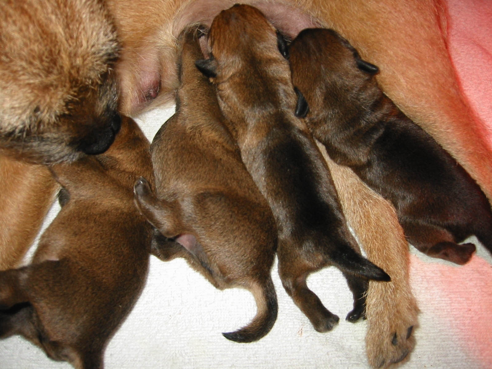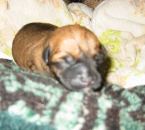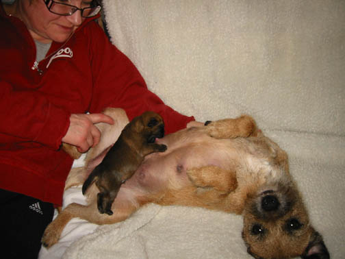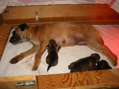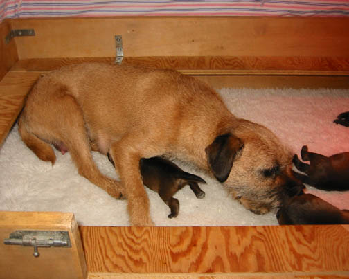 Proud momma and 6 day-old pup-a-lumps (2,1,4,3)