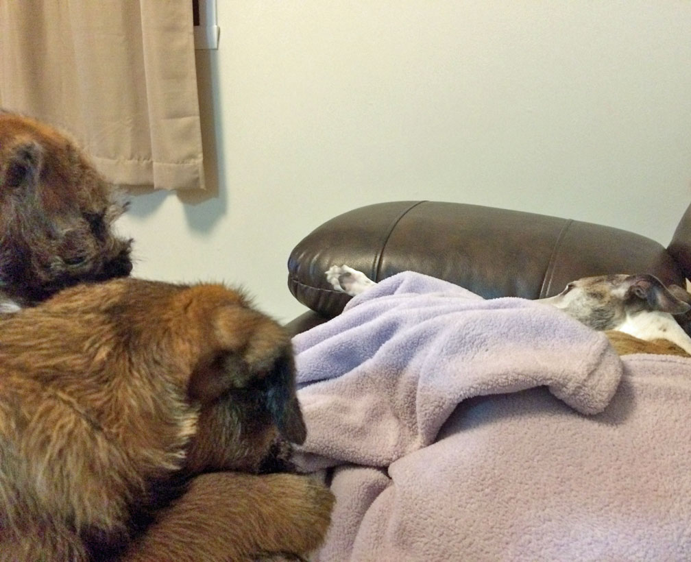 Ruby "going to ground". In fairness, she was not responsible for the "entrance" into the dog bed