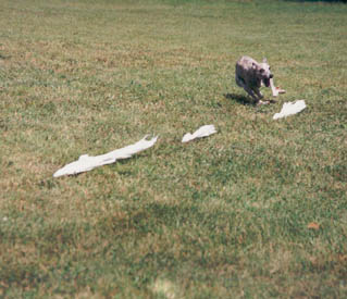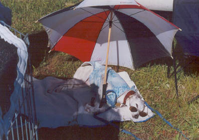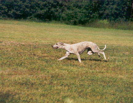 That was the start of a fourteen-year adventure. She coursed, camped and canoed. She hunted with the terriers, locating active holes with unerring accuracy but never participating in the rough stuff. She counter cruised to the detriment of several dishes and raided cupboards to the occasional detriment of her digestive system until we found a foolproof system of bungees, and other whippet-proof devices. She weathered the ice storm of 1998 with barely a shiver - instinctively finding and claiming the warmest spot in our chilly house. She travelled everywhere with us, making friends - two-legged and four - wherever she went.